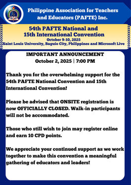 The Philippine Association for Teacher Education (PAFTE) is a five-decade strong association of teachers and teacher educators which has been in the forefront of teacher education since its birth on January 30, 1968 and its registration with Securities and Exchange Commission on March 17, less than two months after its birth.